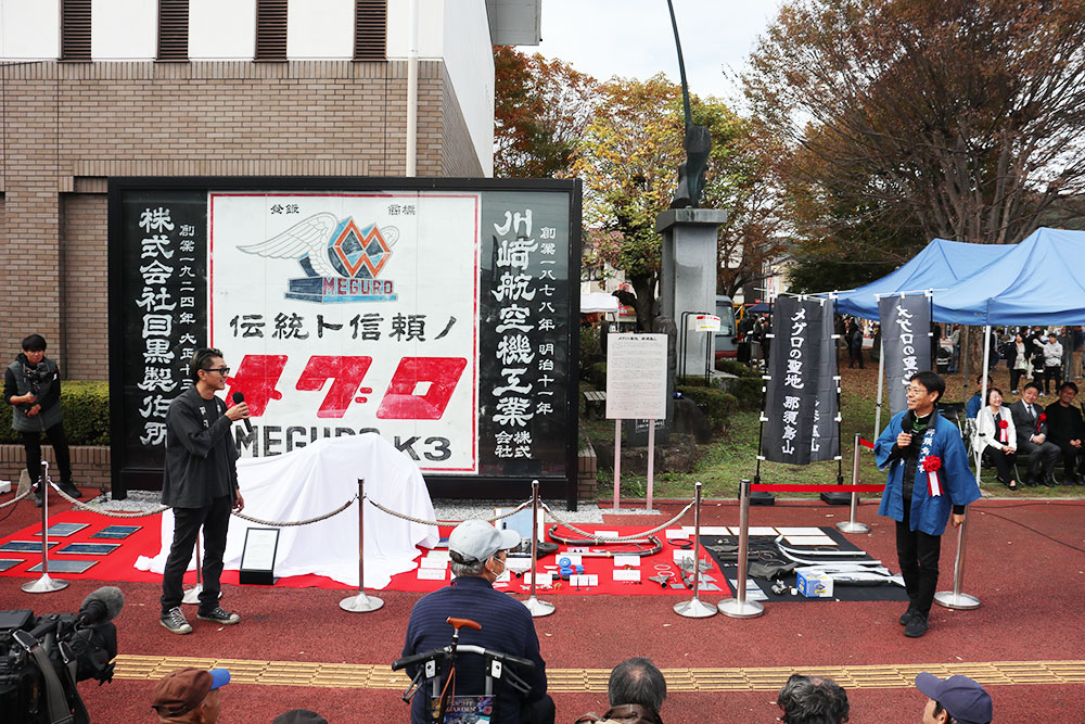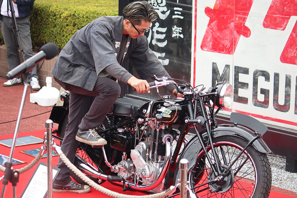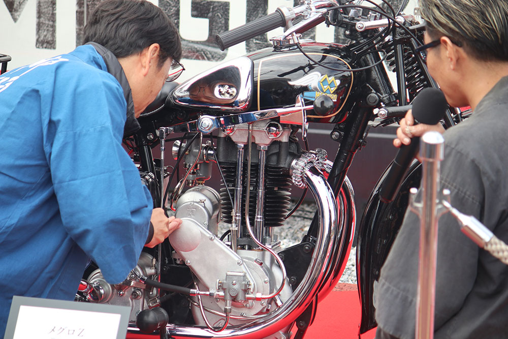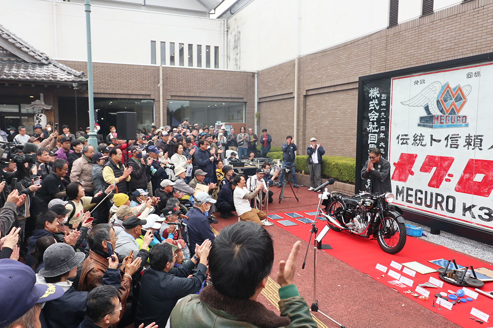 今回の目玉は、2022年より3カ年計画で進めていた那須烏山商工会 工業部会の14社から成る「メグロZ号レストア・プロジェクトチーム」で再生された「メグロZ」のお披露目でした。同モデルは1948年から1951年までのあいだに烏山工場で作られた部品によって製造された945台のうちの1台で、プロジェクトチームには烏山工場の元従業員が創業した会社も含まれていました。