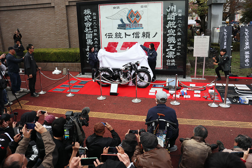 白い幕が外されメグロZが姿を現すと、拍手と歓声が沸き起こりました