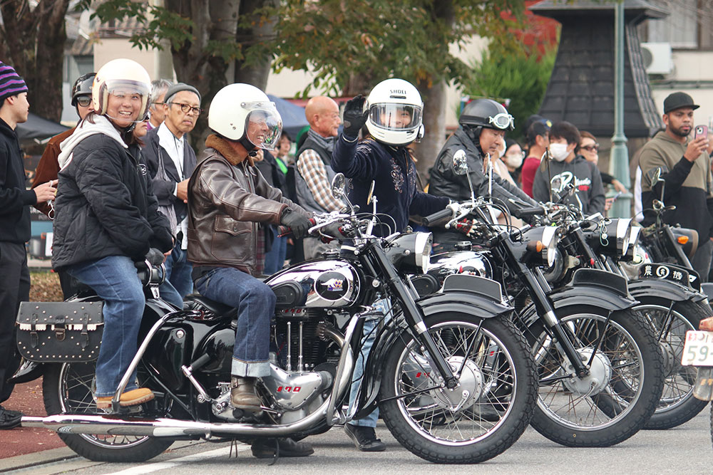 歓迎セレモニーでは、那須烏山市の川俣 純子市長による挨拶がありました。同氏はバイク免許を持たないものの、獣医でありバイク好きの祖父が所有していた2台のメグロを譲り受け、今も保管しているそうです