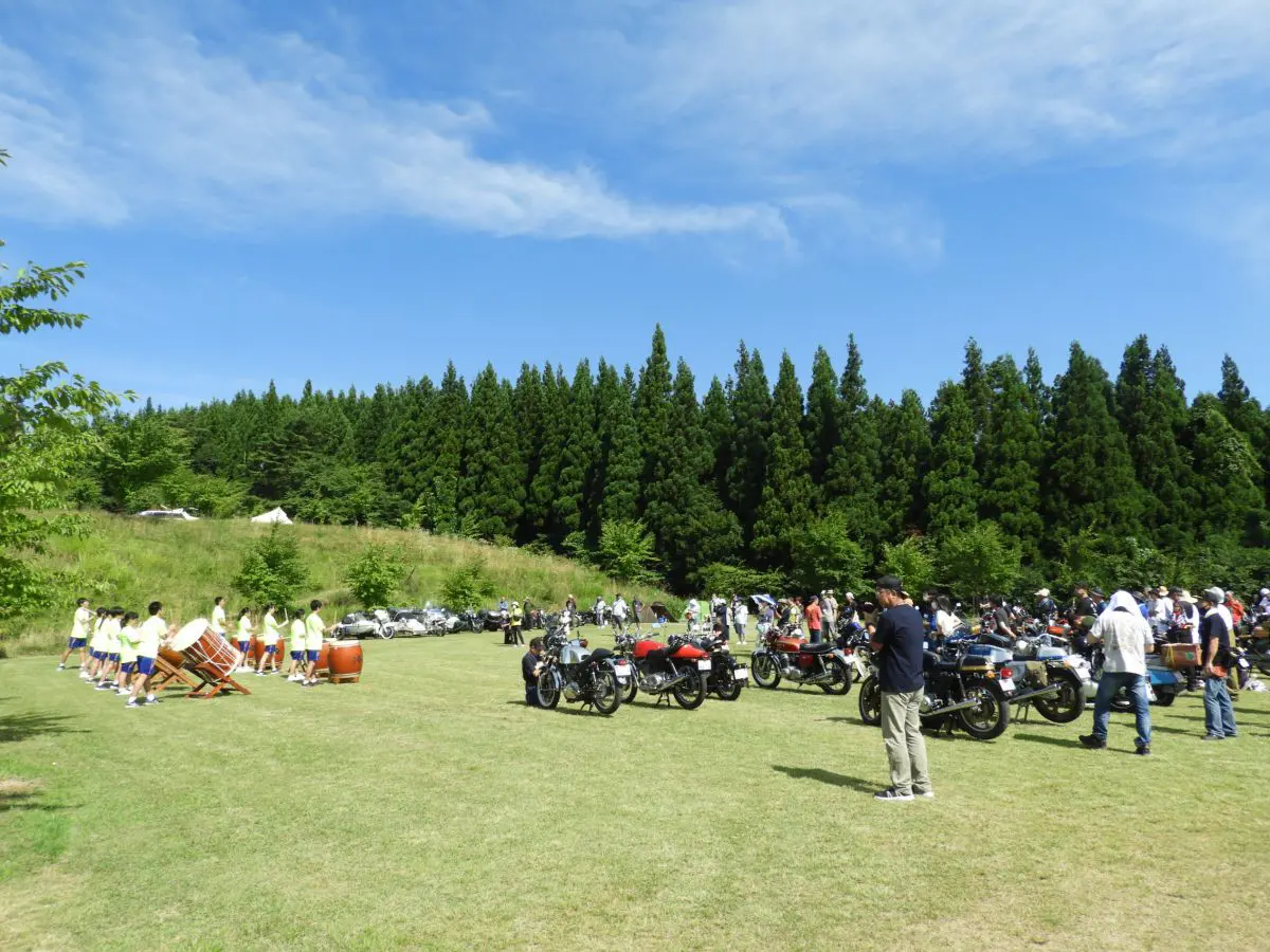 岩手県二戸市浄法寺町は、県庁所在地である盛岡市をさらに北上すること75kmに位置する青森県の県境付近の町です。朝9時から開催される予定のミーティング会場へ向かう道中、バイクの姿はおろかクルマすら通らず、日時や場所を間違えたのではないかという不安を抱きながらなんとか到着。ちょうど町の中学生たちによる浄法寺太鼓の演奏が始まるところでした。
