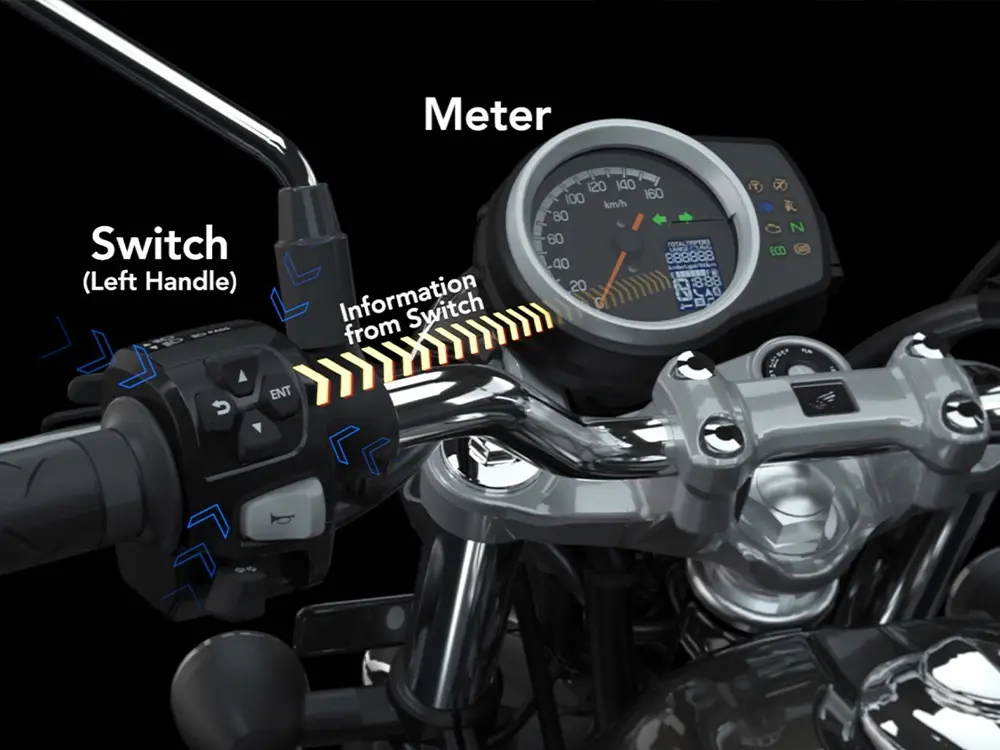 スマートフォンとバイクをBluetoothで接続して、スマートフォンに入っているナビゲーション、電話、メッセージ、音楽を、運転操作を妨げることなく利用できるシステムで、Hondaとグループ会社のDrivemodeで共同開発された独自技術です。