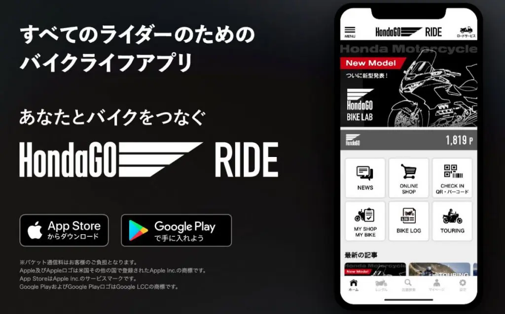 このアプリでは、バイクに関する情報を入力したりツーリング記録を作成・公開することで、バイクライフを楽しみながらHondaGO RIDE独自のポイントを貯めることができます。さらに、HondaGO BIKE RENTALを利用することで利用料金の1%がポイントとして付与されます。貯まったポイントは、HondaGO BIKE RENTAL利用時やHondaGO BIKE GEARでのお買い物時に1P=1円でご利用可能です。