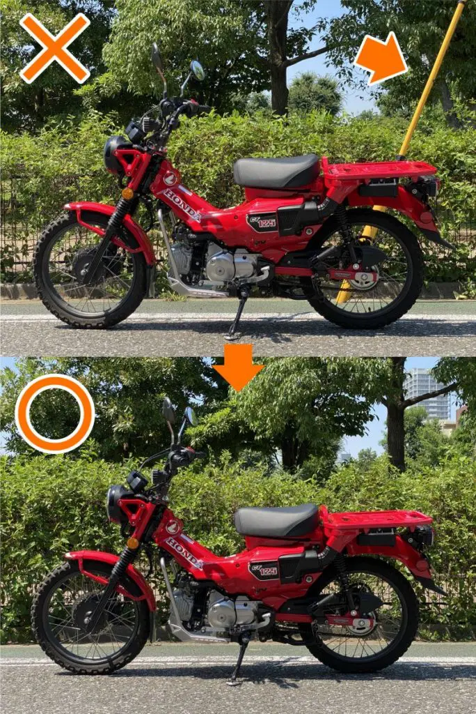 バイクを数メートル押すだけでムダな写り込みが解消できるケースが多いため、“串刺し”写真にならないよう気をつけてみてください。