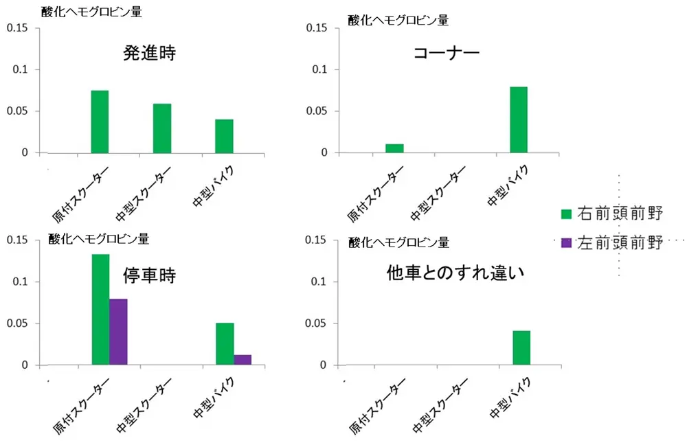 1つ目は、日常的なMTバイクの利用者と、スクーター利用者の比較では、脳の前頭前野の活動に違いが見られ、MTバイク利用者の方が様々な走行シチュエーションで右半球前頭前野の活動が高い傾向にあった。