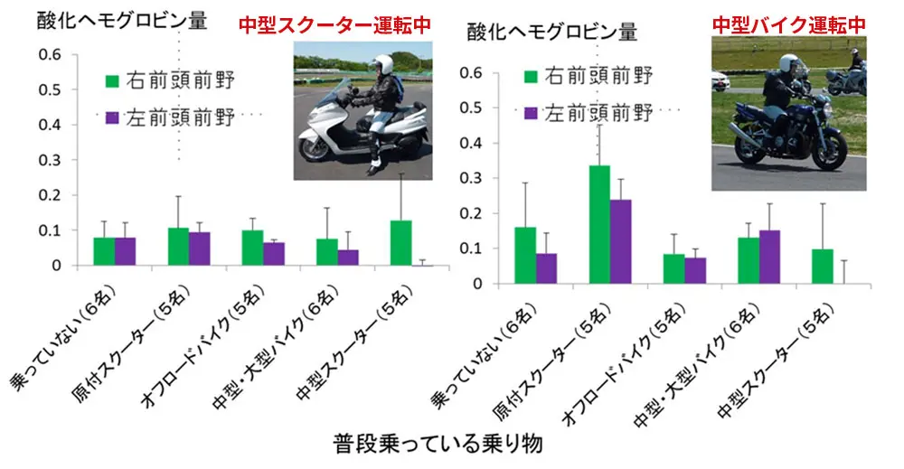 この実験においては、日常的にバイクに乗っている人と、スクーターに乗っている人に分けて比較した。