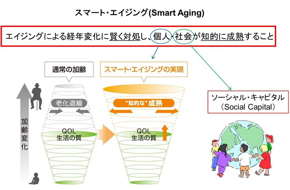 エイジング(加齢)とうまく付き合うためには、こころ(脳)も身体も元気であることが必要最低限の条件であり、決して加齢に逆らうアンチエイジングではなく、個人も社会も知的に成熟することを目指すスマートエイジングの考え方が重要だ。