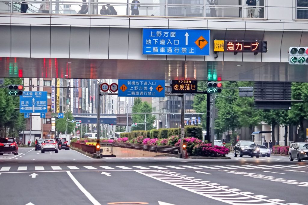 新橋地下自動車道の終点である中央区銀座7丁目13番10号を見ると、その先は原付を対象とした二輪車通行禁止道路に変わります。ここの合流地点からは原付二種以上は通行可能なので、原付一種や特定小型原付を利用する方は地上の一般道を走行するようにしましょう。