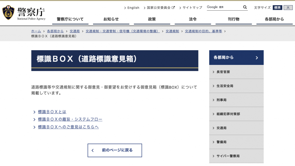 そんな道路環境をより良くするための方法の一つが、警察庁が設置する道路標識・標示をより良くすることを目的に、国民からの意見を受け付けるご意見箱「標識BOX」の活用です。