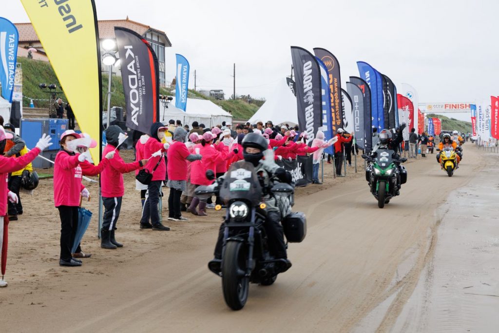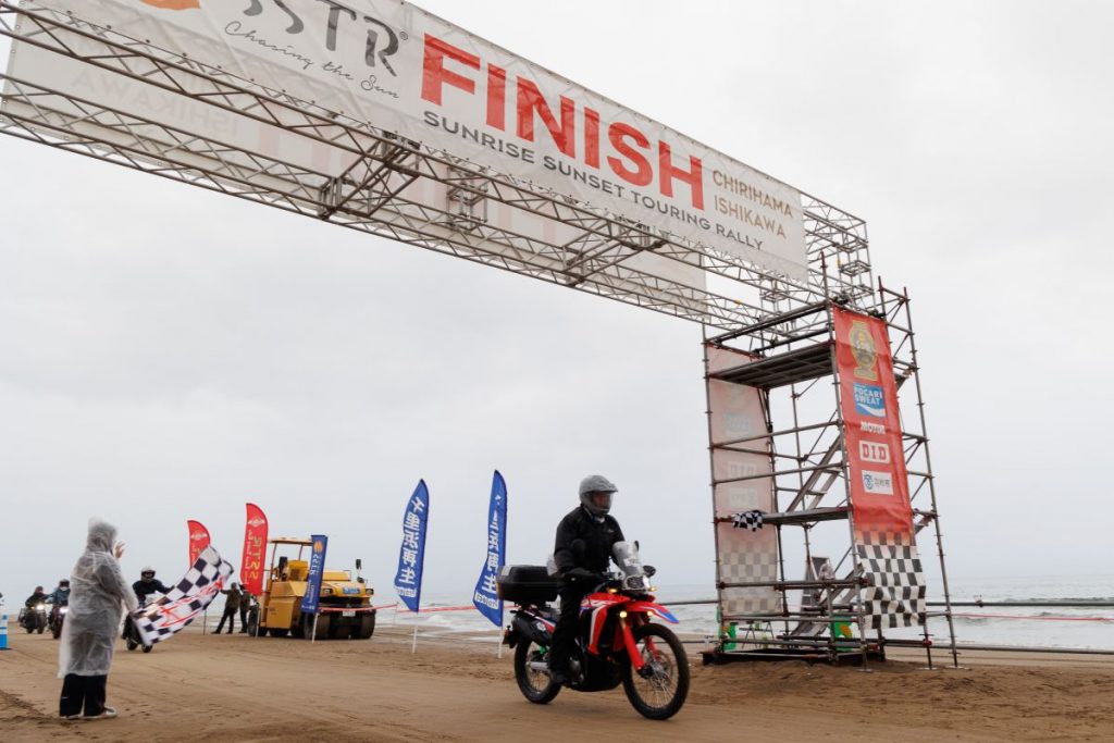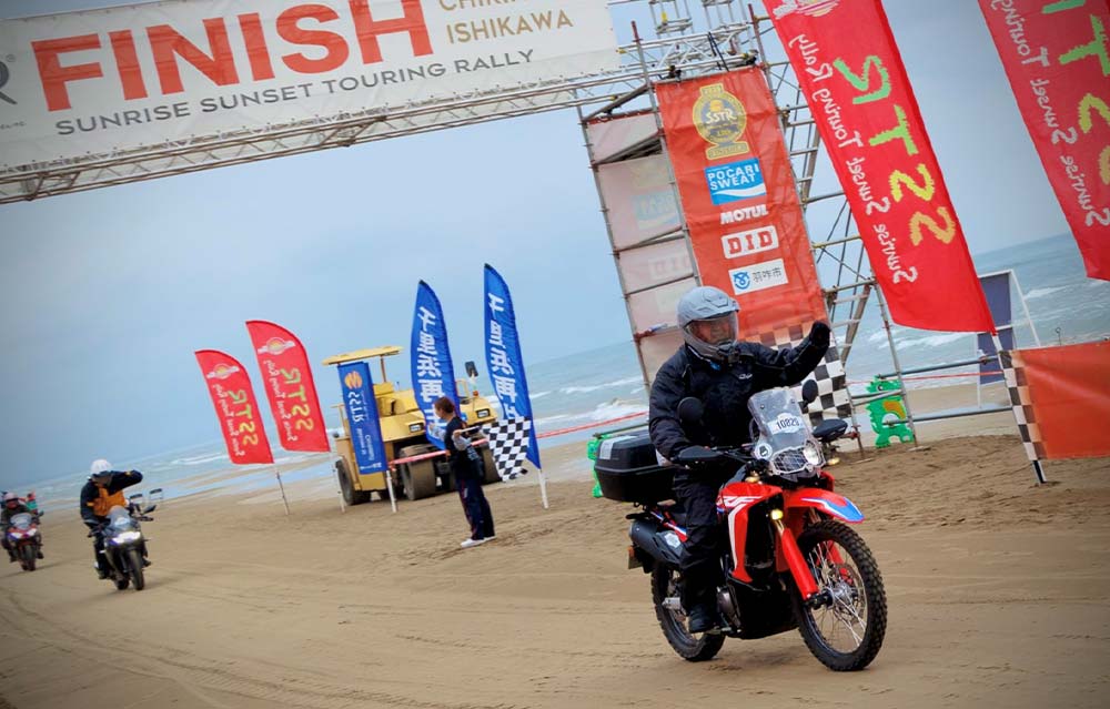 日本人として初めて二輪車でパリ・ダカール・ラリー(パリダカ)に参戦し完走を果たした冒険家の風間深志氏が石川県を訪れた際、千里浜の海岸に沈む夕陽を見て思わず「まるで(当時のパリダカのゴール地であるダカールの)『ラック・ローズ』のようだ!」と讃え、ここをゴールとする冒険ラリーを企画したのがSSTRの由来です。2013年の第1回は130台だった参加台数も13回目を迎え、今年は12,000台を超える国内最大級のツーリングイベントになりました。