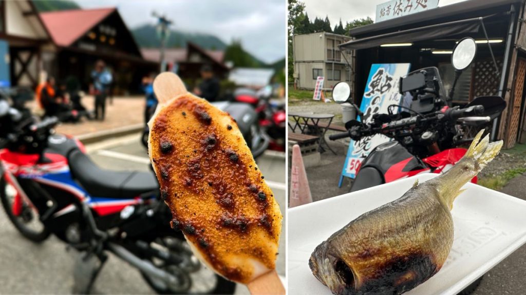 全長およそ4kmの安房トンネルを抜けると一面の霧!雨ではないものの慎重に坂を下り、道の駅「奥飛騨温泉郷上宝」で一息。名物の五平餅をいただきます。SNSでよく「 #ライダーの義務 」といわれるソフトクリームは、寒さのため断念。