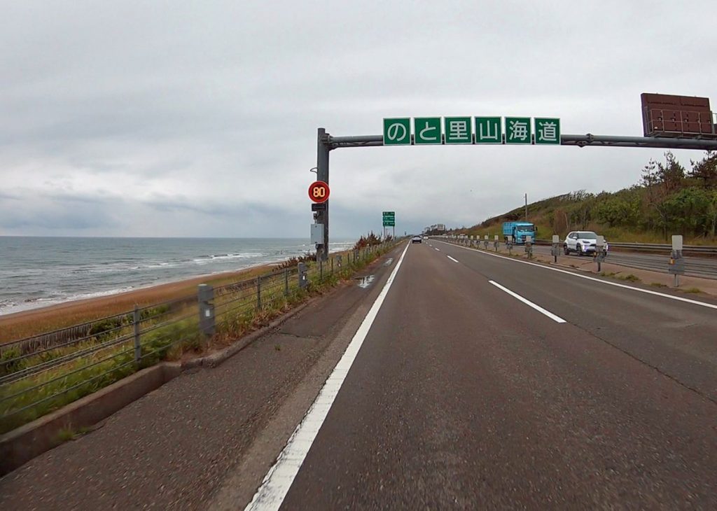 砺波(となみ)平野を横切るといよいよ石川県に入ります。ここにきて時折雨脚が強まってきました。日本海が見えてくると指定「能登半島地震被災地応援スポット」の一つである道の駅「内灘サンセットパーク」にチェックイン。ここからは海岸沿いに進路を北に取ります。ゴールまであと約30km!左手に日本海の荒波を見ながら快走する「のと里山海道」は、震災直後の報道でよくご覧になった方も多いことでしょう。今では路面もすっかりキレイに修復されています。しかし果たして波が高いとこの先の千里浜は入場できるか不安がよぎります。