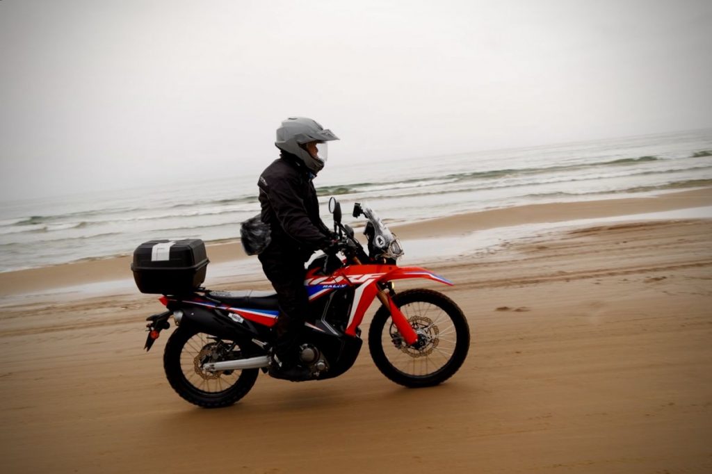 今浜ICで、のと里山海道を降りると「通行可」の看板が!実は過去2回SSTRに参戦して、いずれも千里浜なぎさドライブウェイは高波による通行規制となっていたため、今回初めて全線を走破できることに。一般的に砂地はバイクにとって非常に運転しにくい路面ですが、このドライブウェイは定期的に散水するなどして整備してくれています。この日はあいにく時折雨が降る残念な天候ですが、その代わり砂浜が締まってとても走りやすい!文字通り「雨降って地固まる」を体験。