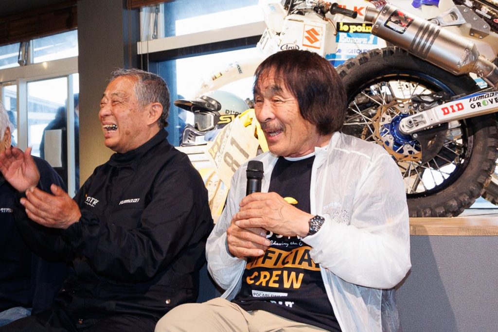 ゲート付近には完走者を労うSSTR総合プロデューサーの風間深志氏とともに、元祖「旅ライダー」で作家の賀曽利隆氏(以下、賀曽利氏)の姿も。