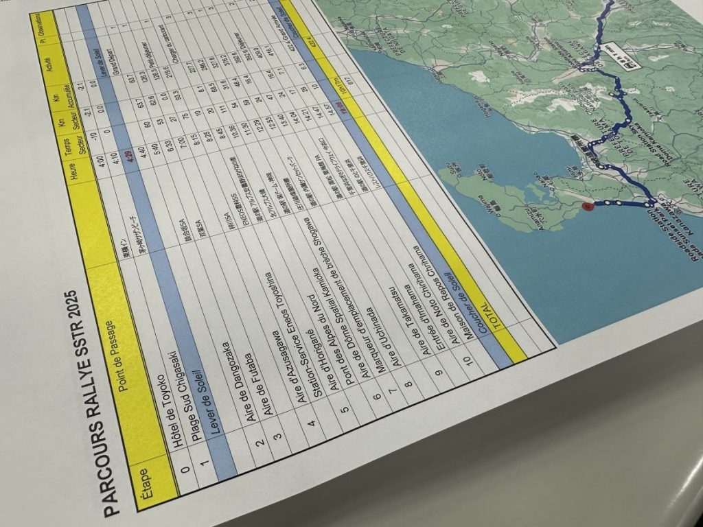 よく「旅は準備が一番楽しいよね」と言われます。指定CPの発表から自分の出走まで1カ月弱。獲得ポイントを計算しつつあれこれとルートを検討するのはワクワクするものです。名古屋の人は最短距離で一番乗りを目指すもよし、東北の人は長距離の記録に挑むもよし、125cc以下のバイクで全線一般道での走破に挑戦するライダーもいます。自分は事前に静岡までリエゾン(回送)して岬ポイントが獲得できる御前崎スタート〜岐阜を北上するルートにしようか悩みましたが、天候が崩れそうなのと、ゴール後現地でゆっくり過ごしたいことから、茅ヶ崎スタートで比較的最短となるルートをベースに、指定CPを経由することにしました。自作したルート表はちょっとパリダカを意識してフランス語で作ってみました。