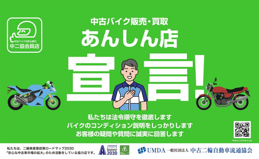 中二協加盟店は、すべて一定の基準をクリアした中古バイク販売業者です。安心してバイクを購入するうえでお店を選ぶ際、目安のひとつとして参考にしてもらえると幸いです」
