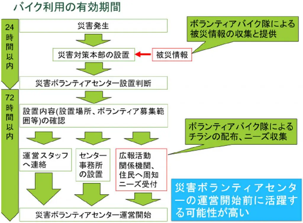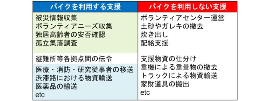災害時にバイクの活動が期待できる支援方法と期間