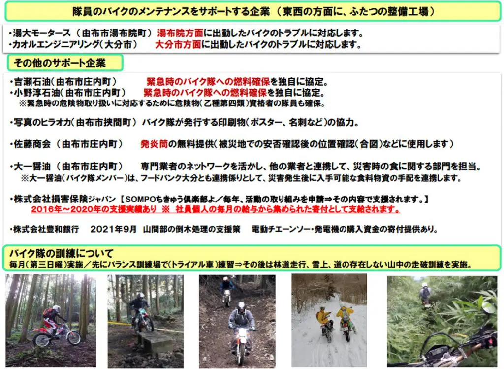 また、由布市バイク隊へはすでに多くの企業が災害時の支援協力に名乗りを上げています。