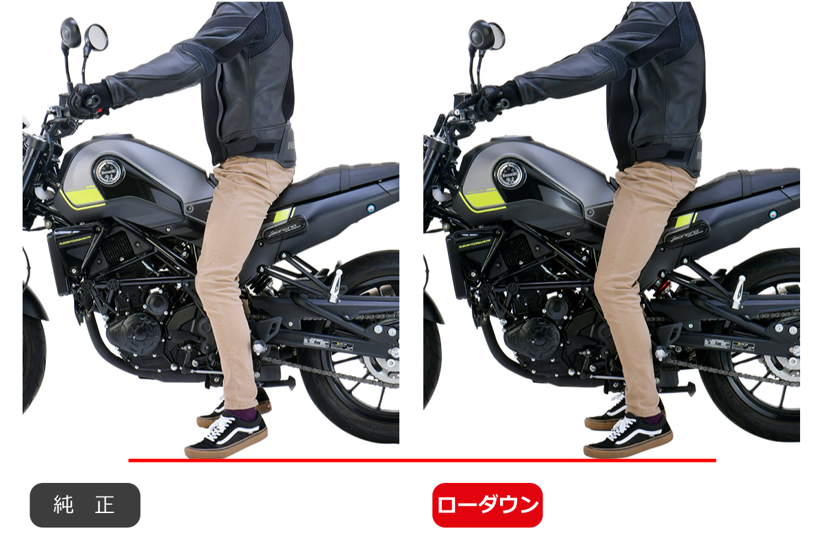 交換することでシート高-約15mmダウンするローダウンスプリングキット。(体重55kg/当社推奨プリロード位置時)プリロード調整することによりダウン量は変化します。乗車1Gによるローダウン化の為、ショートサイドスタンド不要。