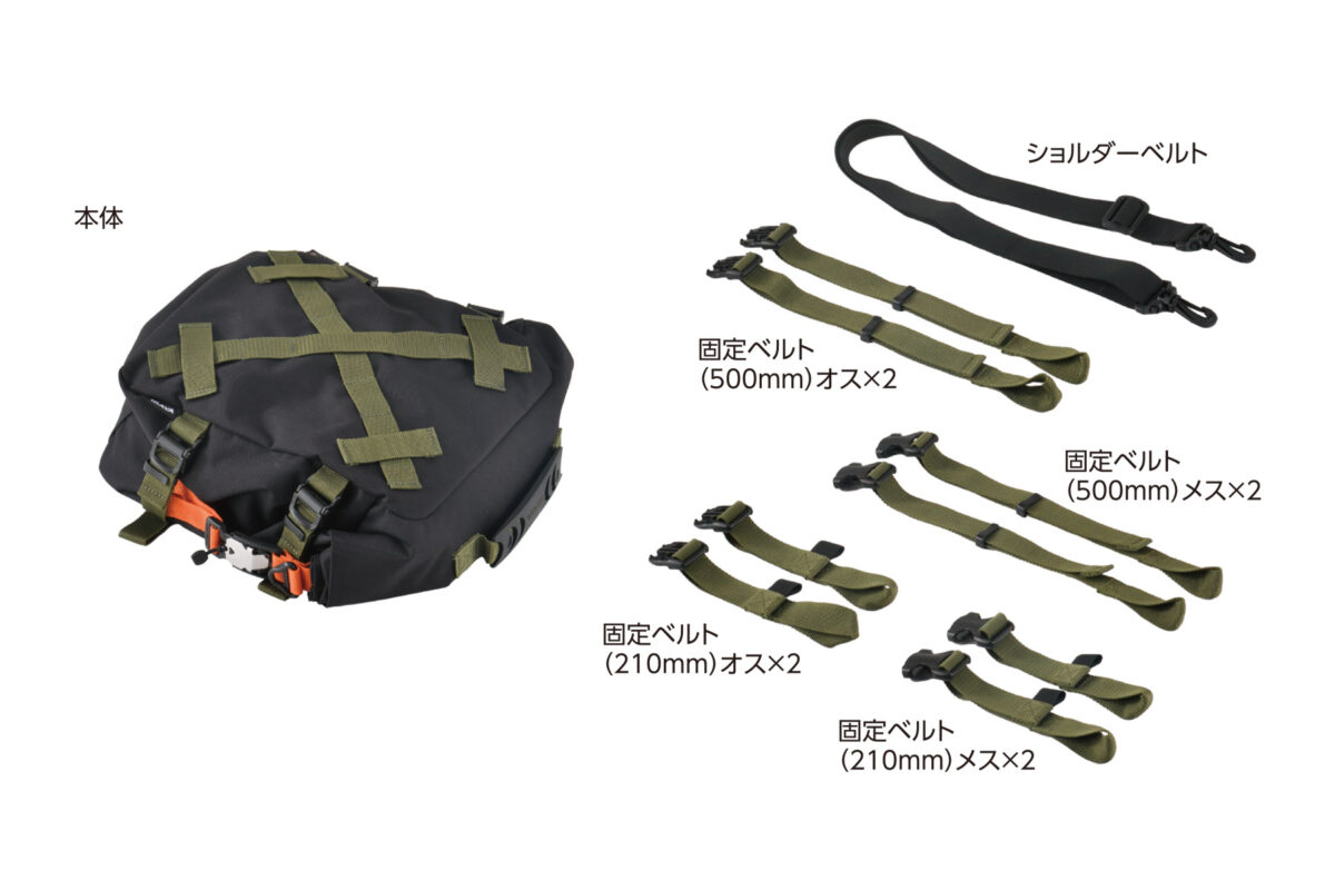 バッグには「X字状のベルトループ」と「サイドベルトループ」を装備、固定ベルトをアレンジして取り付けることでシート/サイドバッグとして活躍します。ツーリング先での移動や普段使いに便利なショルダーベルトを付属。