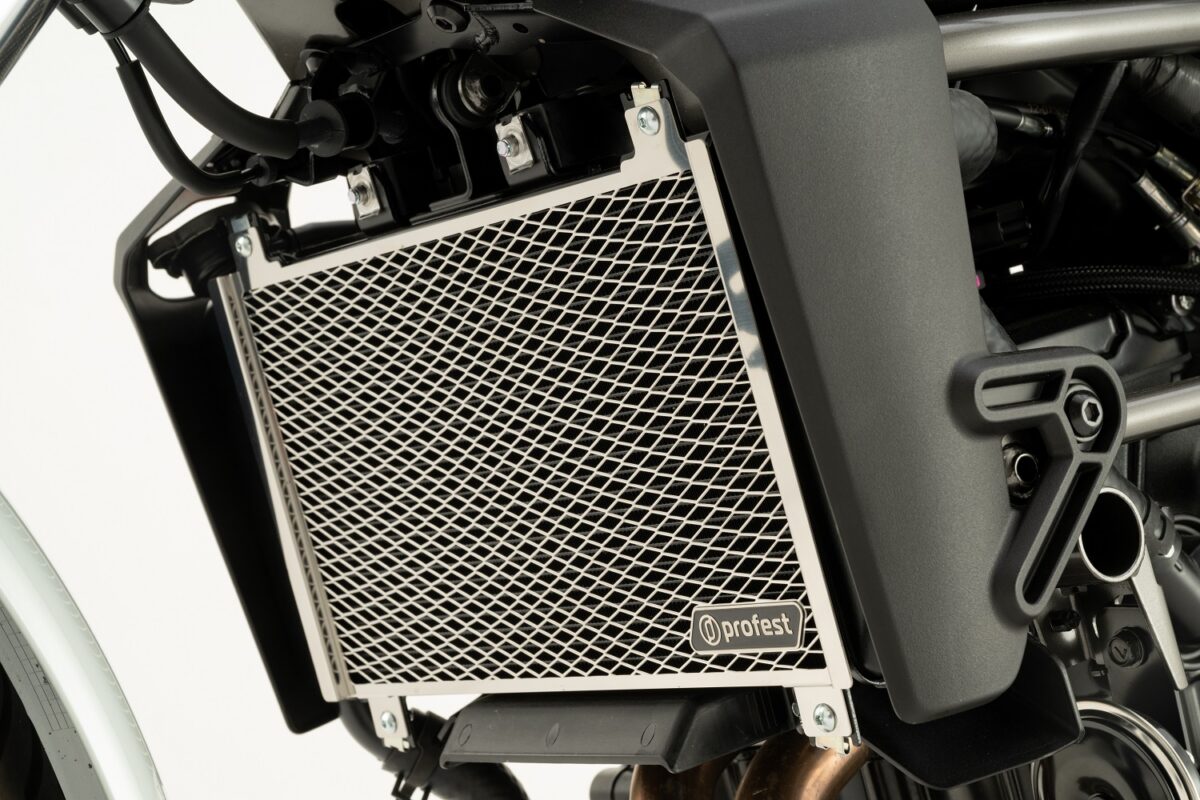 ラジエターフィンを飛び石や虫などから守る事はもちろん、ドレスアップパーツとしても最適。中央から両端に向かって徐々に網目サイズが変化する菱形パターンのコアガード部分とステンレス製エッチングロゴプレートでシックにまとめました。
