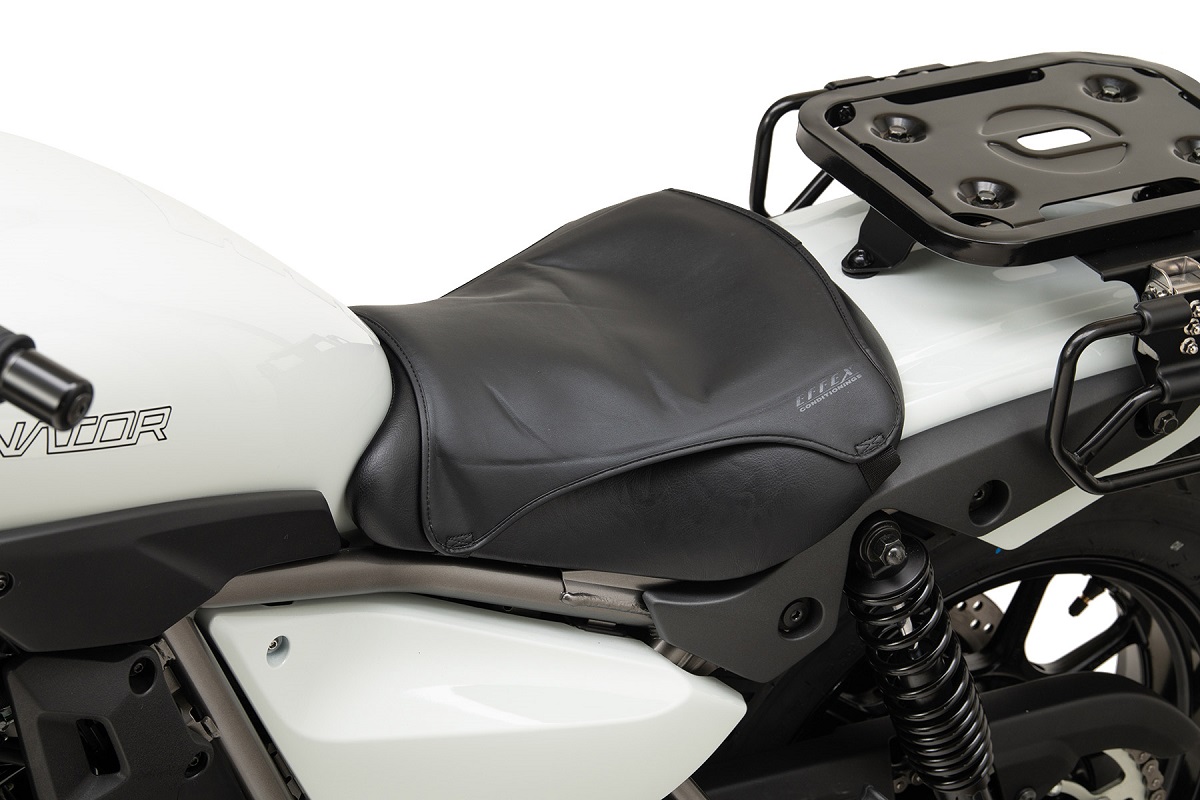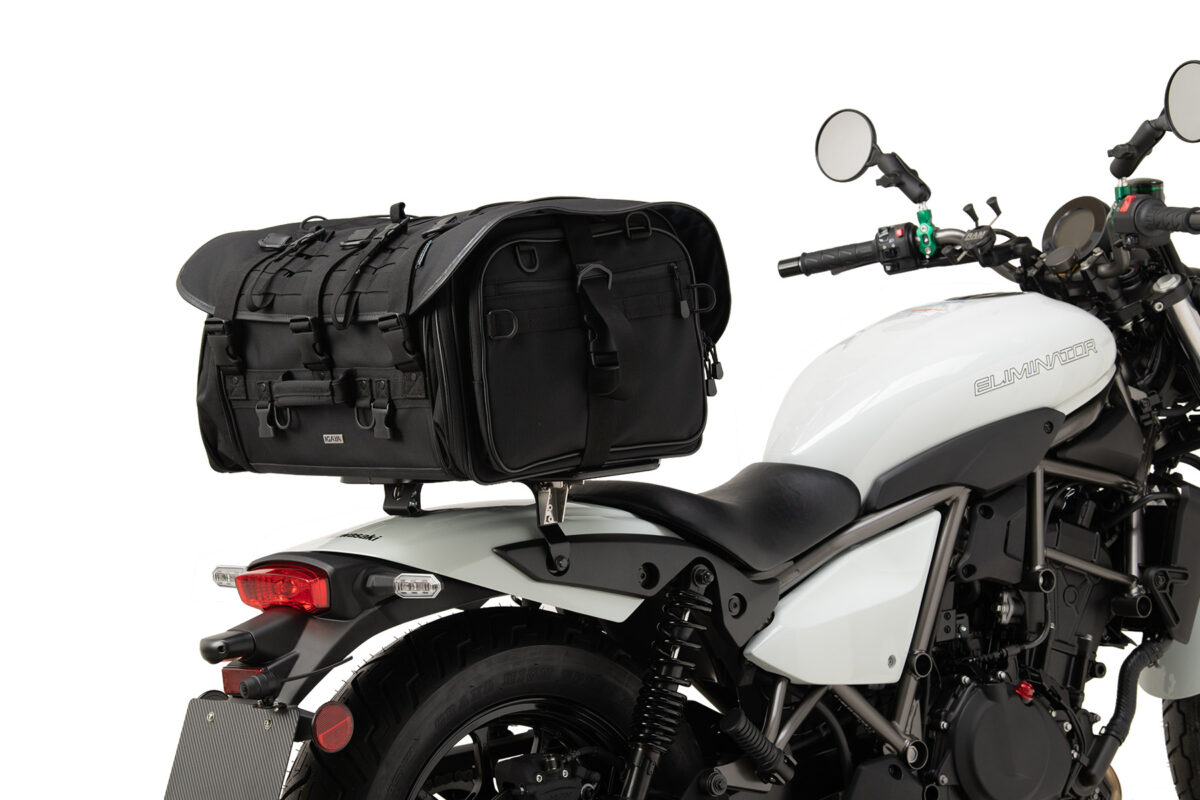 そのシンプルなスタイルを邪魔しないスッキリとしたキャリア。しかし、可変させることで、キャンプツーリングにも出かけらるツーリングカスタムにもできる。さらに収納力の高いイガヤバッグや、シンプルなアイテムを合わせてみました。