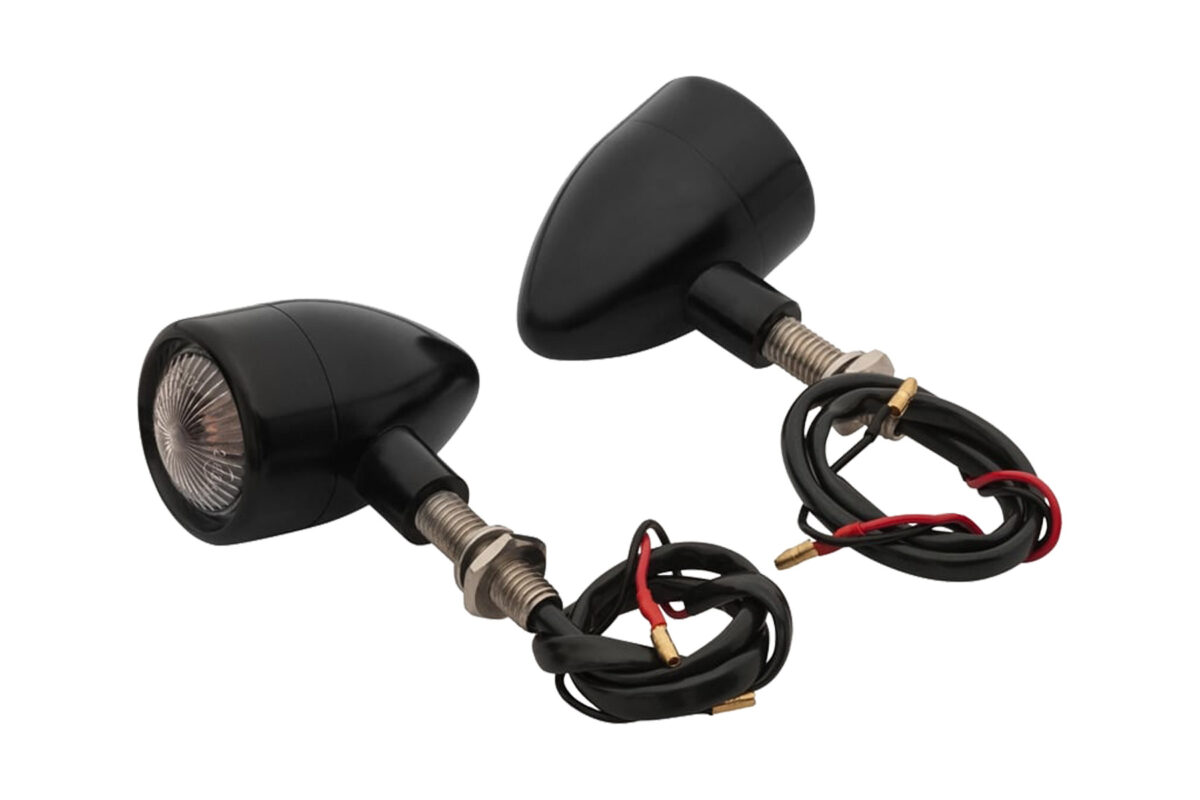 レトロデザインの砲弾型ウインカー。本体は耐食性に優れたA6061アルミ削り出し製。ブラックアルマイト仕上げ。レンズはクリアとオレンジの2種類を付属し付け替えが可能です。