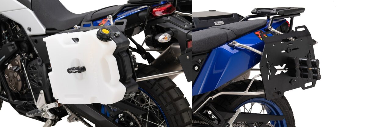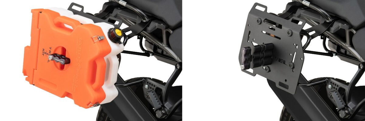 写真上右のようにキャリアにヘプコ&ベッカ リペア Xトラベル汎用プレート 左のみを装着して、写真上左のようにロトパックスコンテナを取り付けます。
