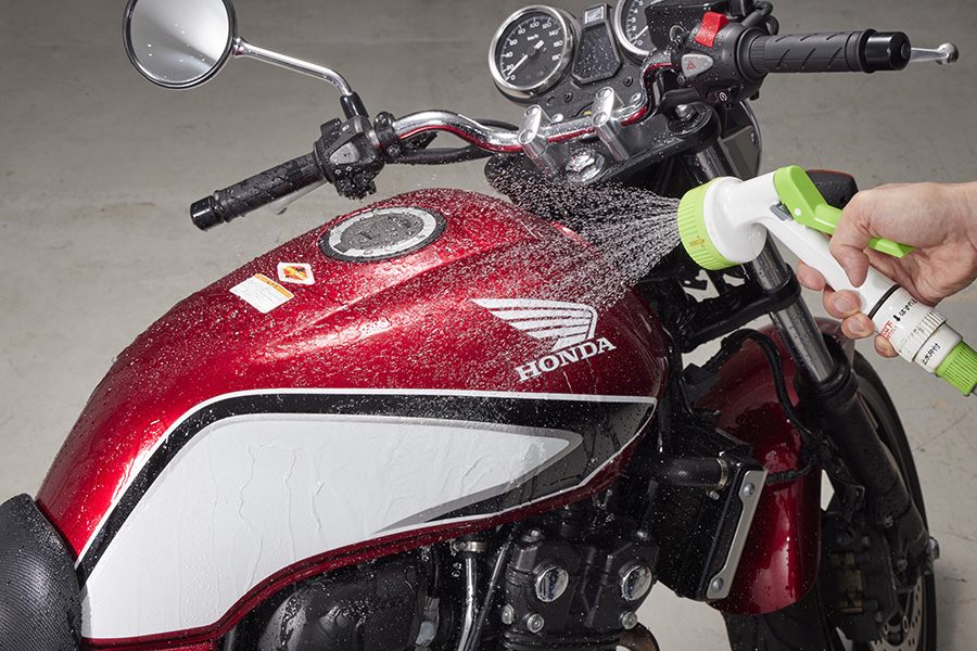すすぎの際も、基本は同じで上から下へ順に作業するのがポイント。すすぎ残しがあるとシミやムラの原因になるので、しっかり流しましょう。シュアラスターのバイクシャンプーはいわゆる“泡切れ”の良さも特徴としていて、スピーディにすすぎができます。
