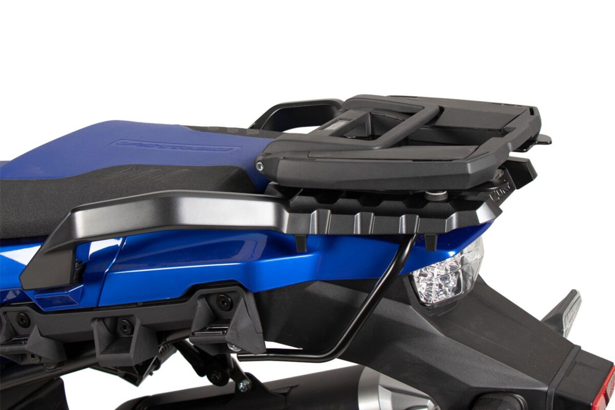 トップケースキャリアEASYラック ブラックV-Strom1050 DE 23 トップケースを取付けるためのキャリア。トップケースを積載していない時はガイド部分を折り畳みフラットに出来るので、ケースを装着しないときもスタイリッシュです。