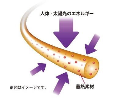 素材のポリエステル繊維に鉱石粉末を練り込み、人体や環境から発せられるエネルギー(遠赤外線)を蓄えて保温する。独自開発した素材を採用することで、蓄熱性を高めている。