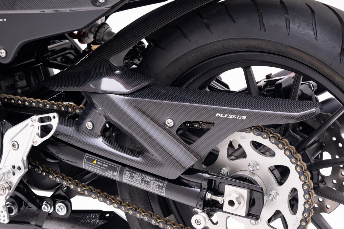 カーボン製チェーンガード。純正リアフェンダーとの同時装着可能。
