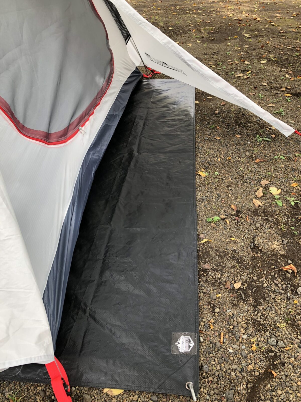 こだわりは室内側にもたくさんあります。まずは奥行き80cmの前室が前後にあり、RR5956のグランドシートを使うと片側40cm分が床アリで使用できます。テントに出入りする際、靴の脱ぎ履きに意外と便利なスペースです。