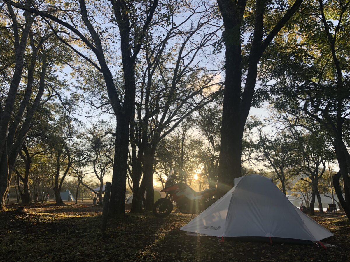 翌朝。さわやかな朝日に照らされるクールグレーのテントもまた、カッコイイ♪