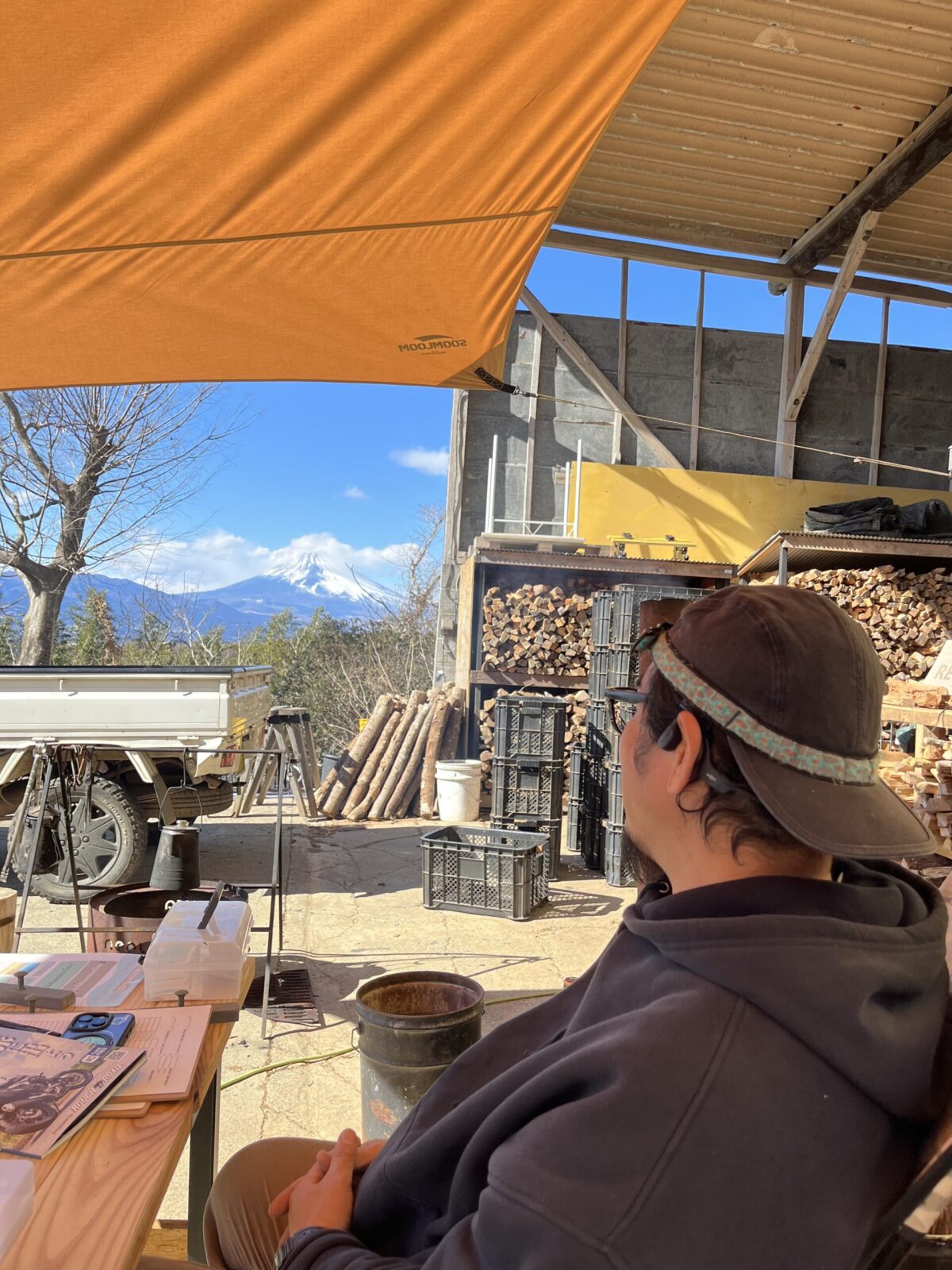 腱さんのいる受付は富士山ビュー、薪ストーブの匂いとぬくもりが最高の職場環境。