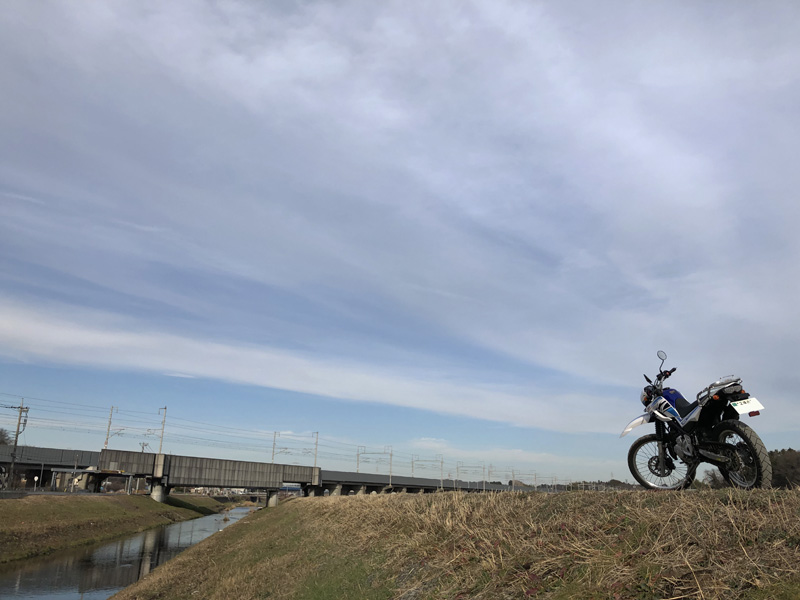 神奈川の内陸の地形は意外と小さな起伏があって、ちょうどよく富士山が丘に隠れたり電線がごちゃごちゃしてたり……。どこもイマイチでウロウロすること小一時間。藤沢と寒川の市境の住宅地を抜けたあたりでパッと視界が開け、小さな川の両側にセローでトコトコ走りたくなるようなちょうどいい田舎道を発見!