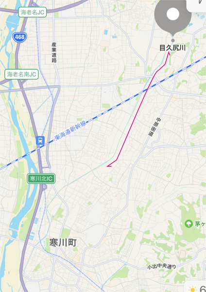 近くにこんなところがあったなんて知りませんでした。今回ウロウロしたのは下図の矢印エリアですが、目久尻川自体は相模原市から寒川町まで流れているようですね。