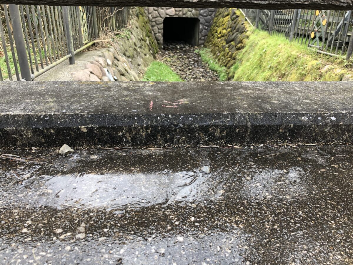 まあ、飲用や工業用でもなく普通の排水や湧き水を集めてきた川、ってことでしょうか。ふと橋の上から下流を見てみると斜面の途中の土管からまあまあな水量の支流とその先にさらに2方向から合流してくる流れが。