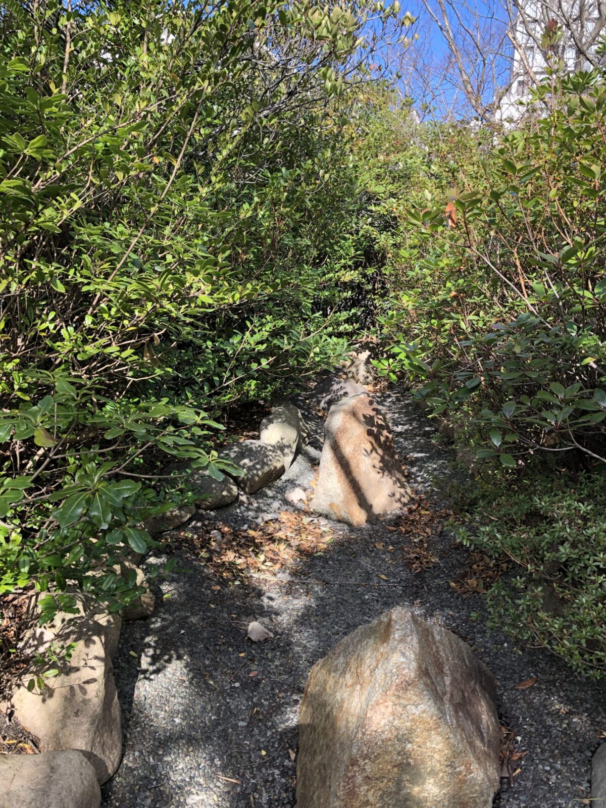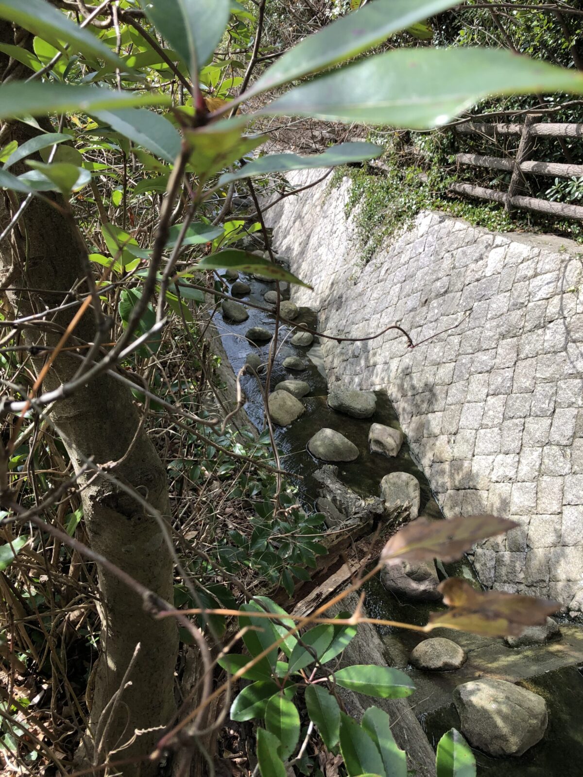 入口になんだか「千と千尋の神隠し」に出てきそうな石碑があるのが気になりつつ登ります……。階段の左側に関根川は見えないのですが、生垣の隙間から覗くとまだ確かに流れがありますね。