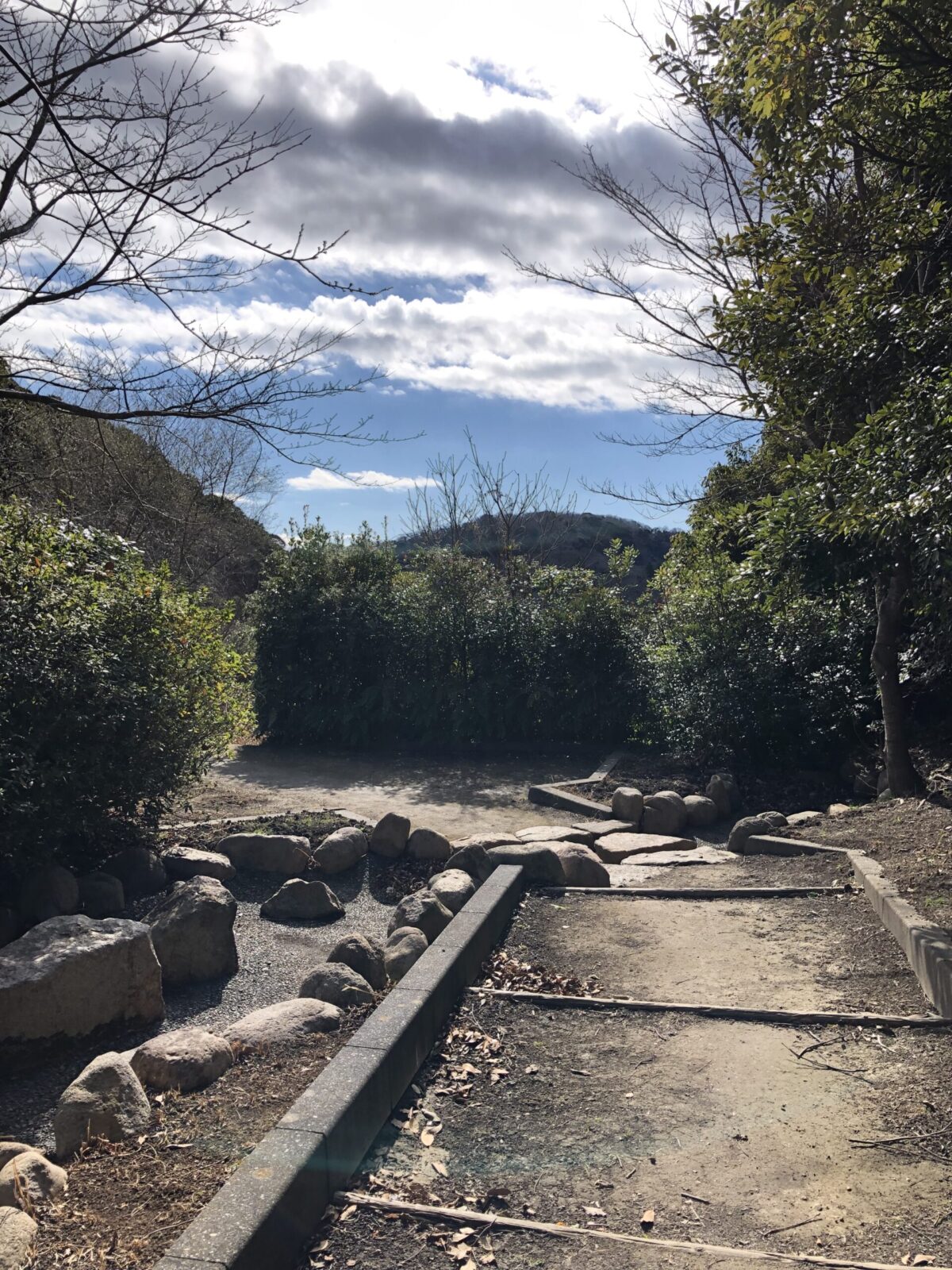 緩やかに続く階段を登り切った先には、水の枯れた池のある広場のようなスペースが。その広場の池の一番下流にマンホールがあり、どうやらそこも先ほど埋没していった土管につながっている模様……。
