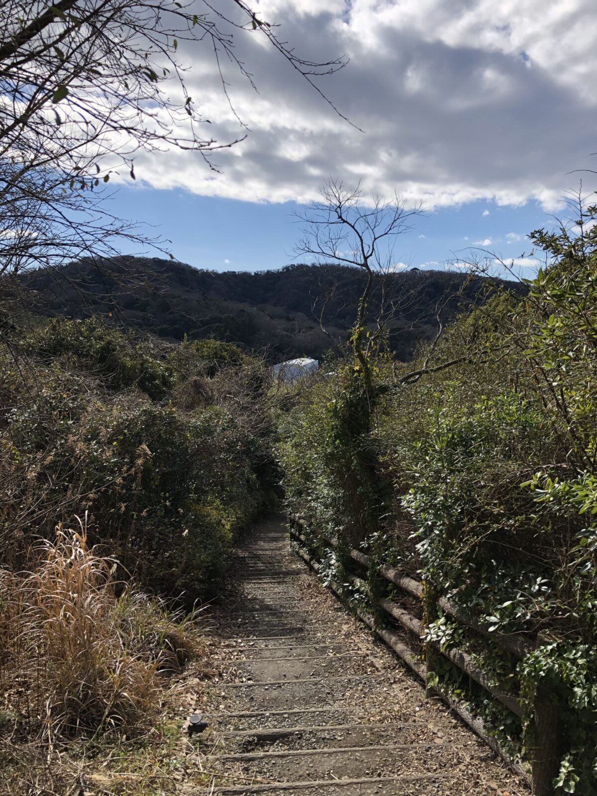 上流に行くにつれ細くなった流れは、心なしか水も少しきれいになったような??その流れは階段状に高度を上げていき、音が静かになるあたりでどうやら斜面の土管の中に消えたようです。ふと後ろを振り返ると三浦半島の内陸部にもまだまだ山があるんだなぁと感じる風景……。