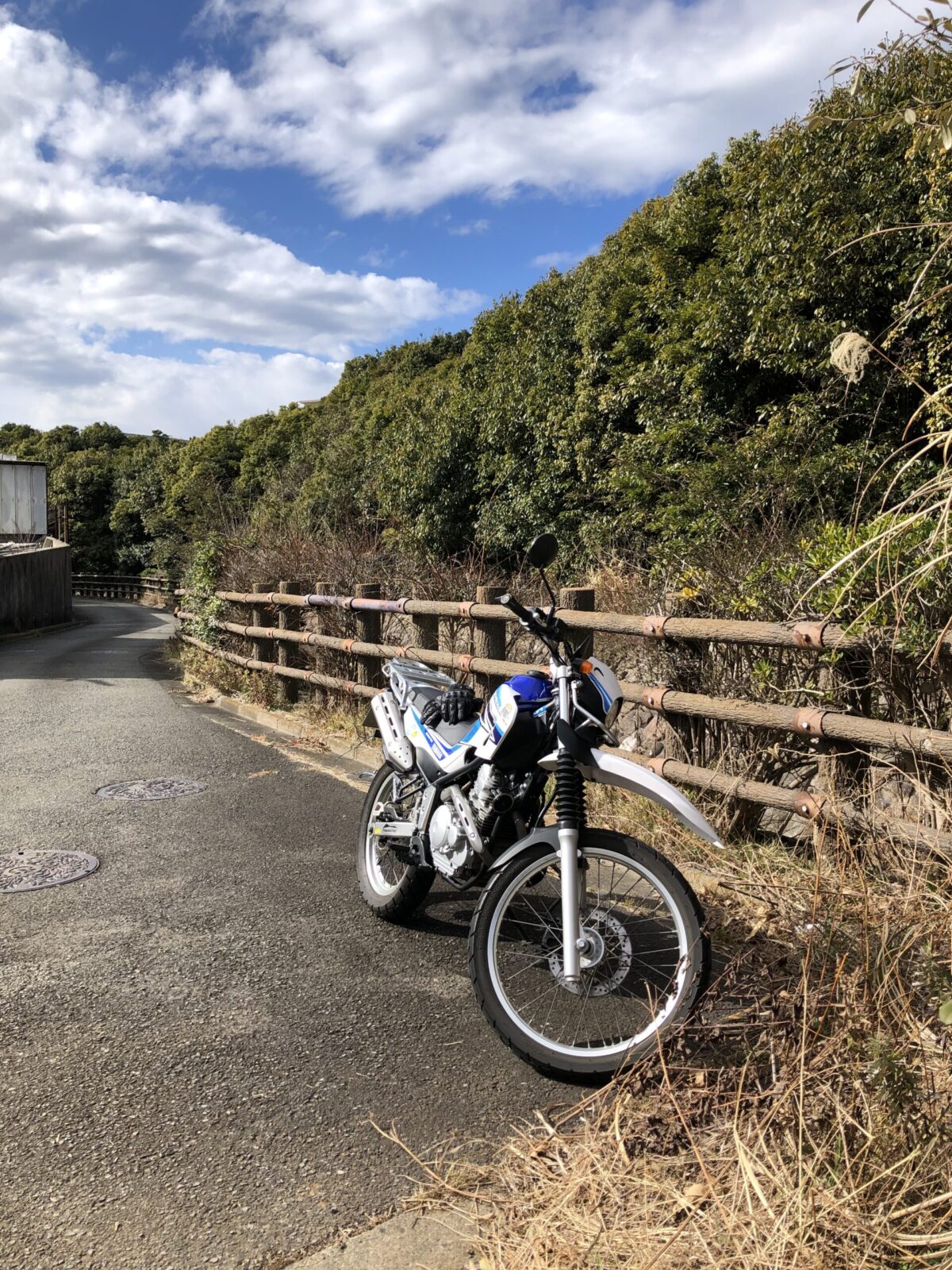 左に流れを感じながら進むとやがて道は大きく右にそれ、流れはまっすぐ上流へと続きます。仕方ありませんね。一旦ここでバイクを降り、階段を徒歩で上がりましょう……。