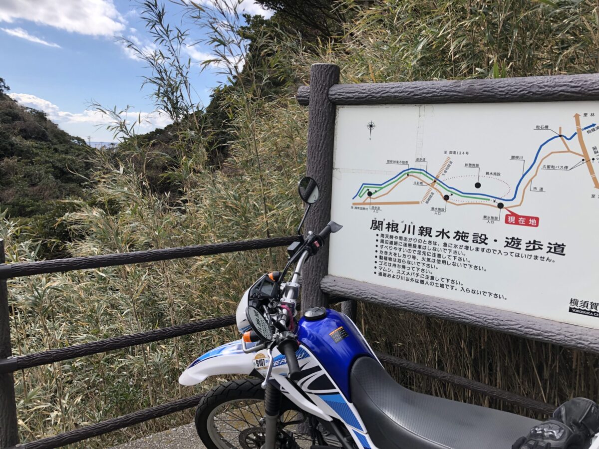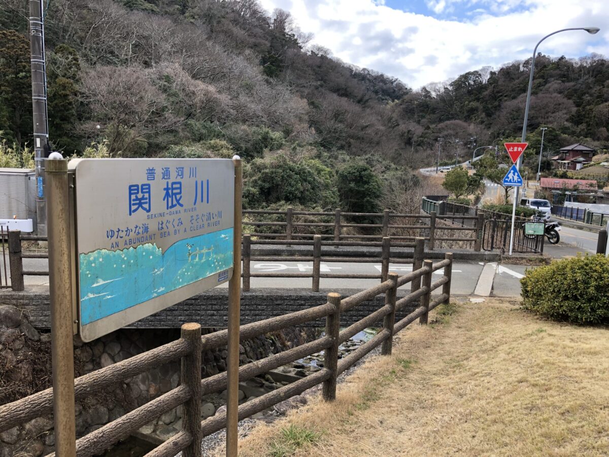 相模湾沿いの134号から湘南国際村にむかう県道217号に入りトンネルを抜けると、ちょっとした里山のような長閑な風景が広がります。比較的交通量のある県道は流れに乗って走っていると絶対気づかないであろう、右側の土手の陰に「普通河川 関根川」の看板を発見!