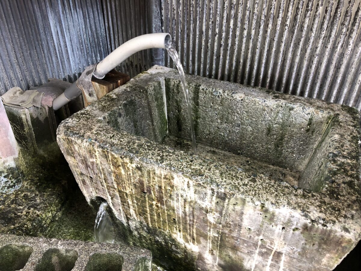 ガラス引き戸を開けてお参りしつつ横を見ると水が出ていますね?ややぬるめの湧き水的な??