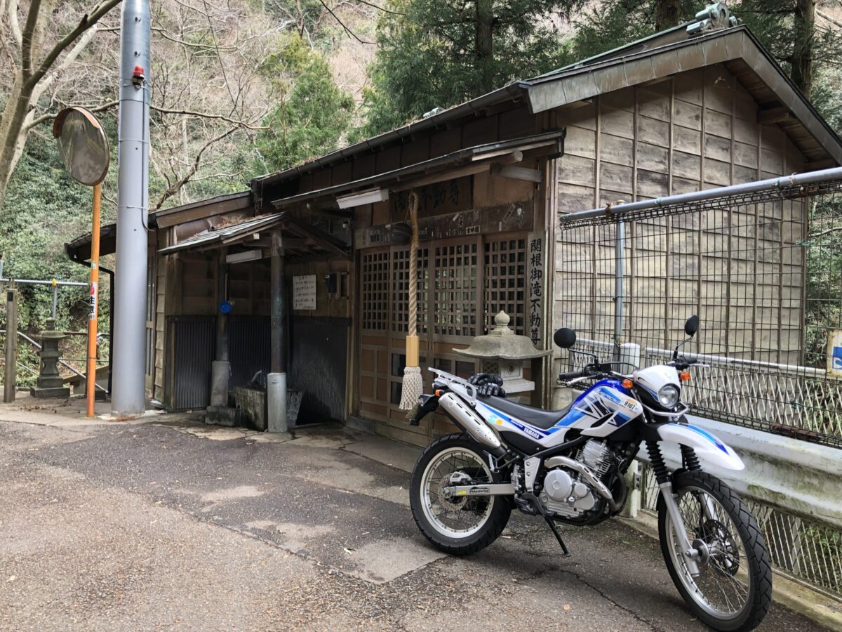 ひんやりと山影で水が凍っているこの地点こそが関根川の源流に違いない!とココロに思いつつ、流れをたどるため今一度県道へ復帰、トンネルに入る手前を川沿いに左にそれる小道を発見。うっそうと茂る杉林の中の道を進むと通り沿いに「関根御滝不動尊」という神社が。