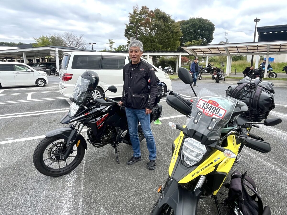 出発直後はこんなに晴れてたのに急に雨が降るって、やはり日本は広い(長い)……。どんどん東京に向かって南下してくると3連休最後の休日を惜しむようにバイクの数が増えてきます。茨城の友部SAでは色違いのVスト250SXに乗るベテランライダーにご挨拶。