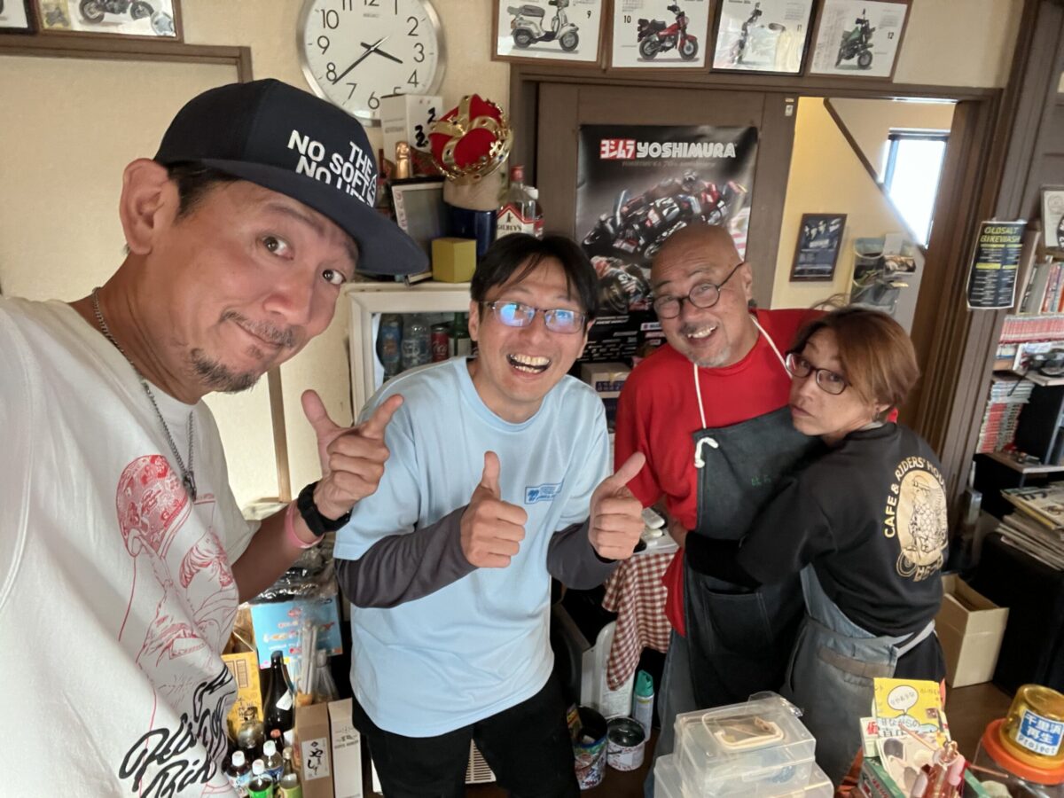 外壁や店頭のドラム缶に貼られたおびただしい数のSSTRゼッケンや魔改造されたカブ、ゴツイ旅バイク、建物横のガレージ、旭風防ののぼりなど、もしかしてヤバいバイク屋? と思うような外観のココはSSTR参加者には有名なカフェ。