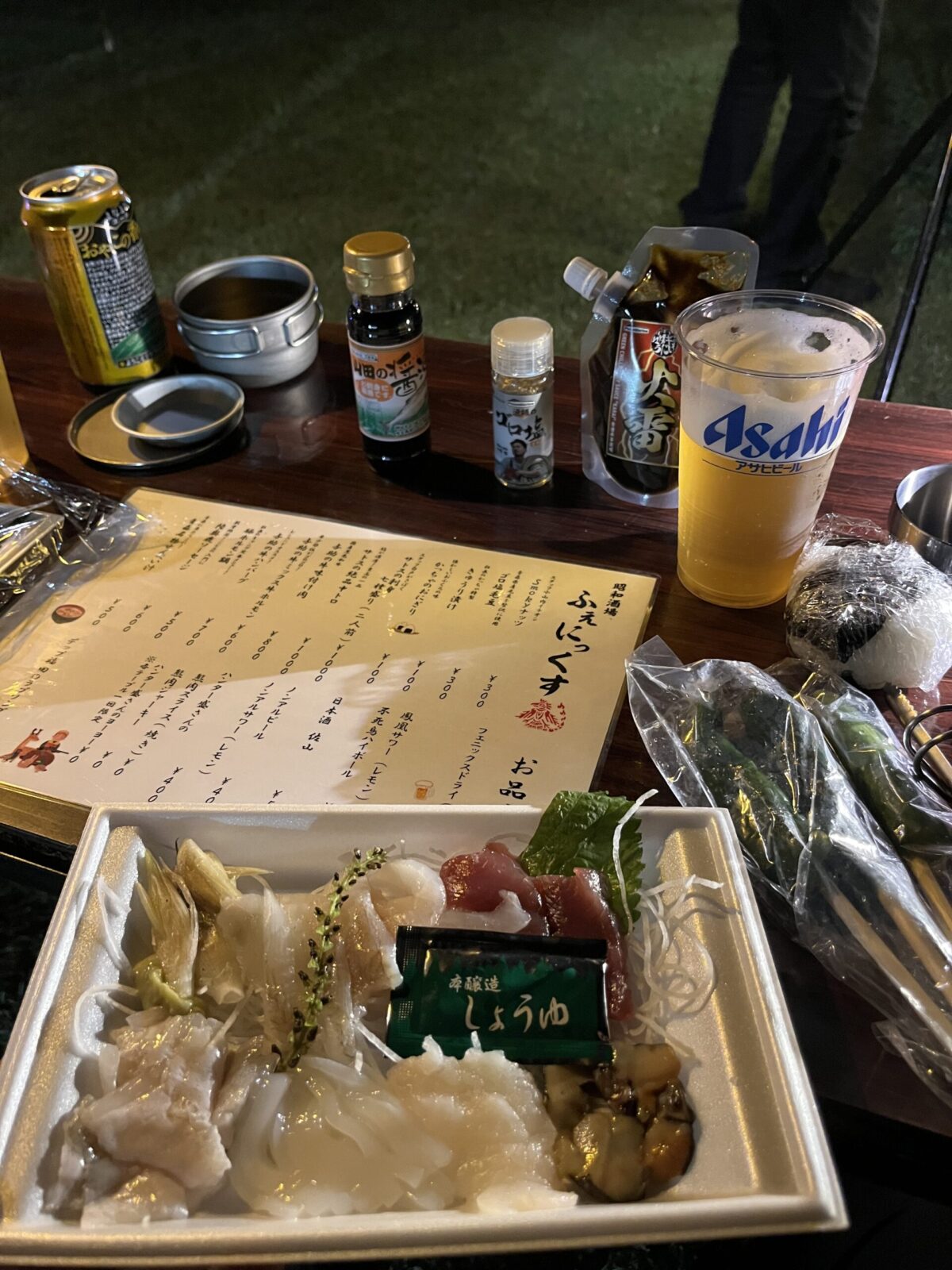 ここホントに山の中のキャンプ場?っていうくらい充実していて、ワタクシ今回自分の買出し一切ナシですべて現地調達でした(汗) プロの板前さんが準備したお刺身セットや社長のお母さんが握ったおにぎりなど、美味い居酒屋メシをずっと頂いてました♡