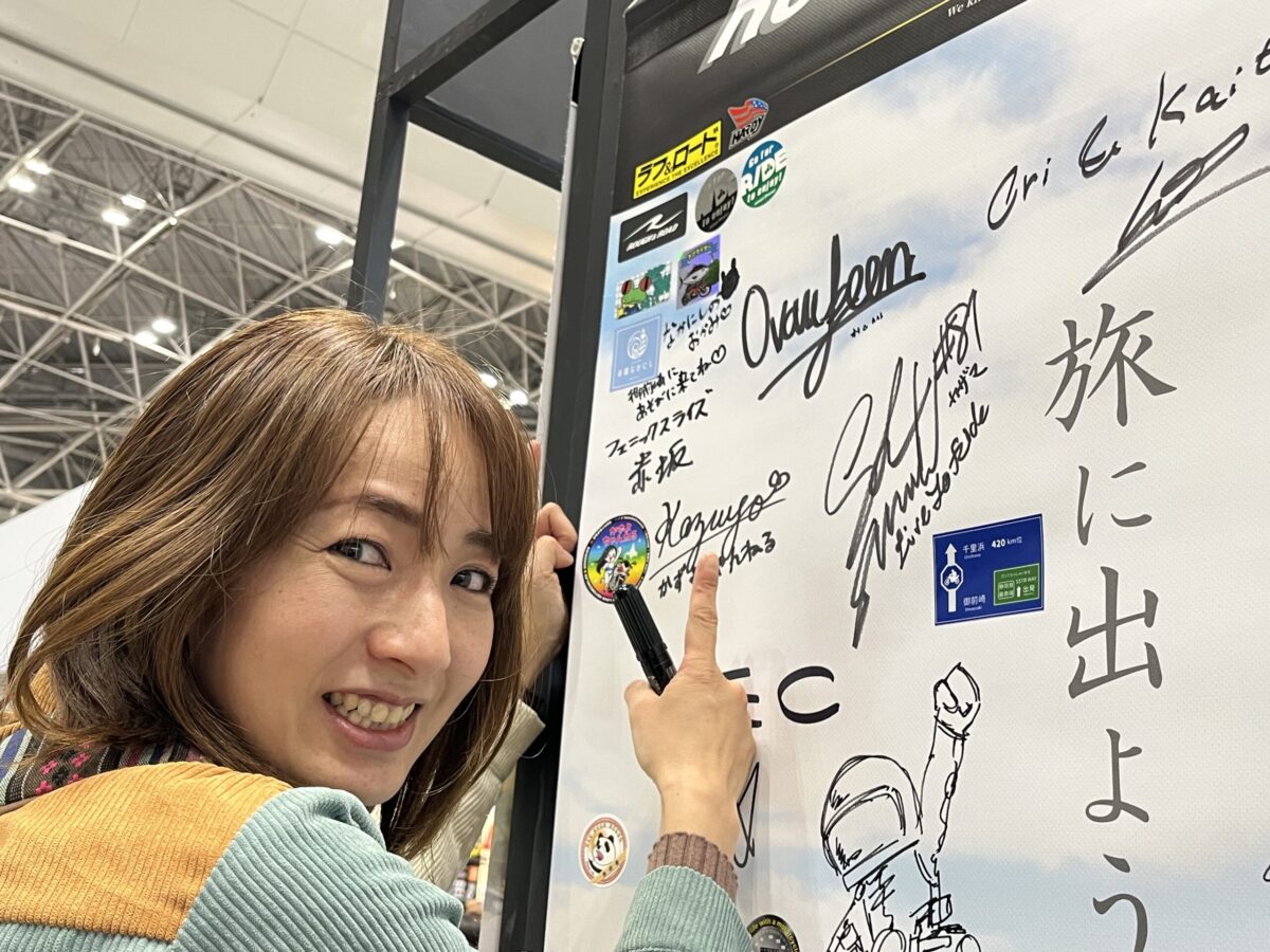 御前崎出発のSSTRライダーにはすっかりお馴染みになった、この看板の作成娘として撮影させてただいており、この方が実は有名なお宿なかにしの女将さんだと一致したのはつい先日のモーターサイクルショーの時(汗)