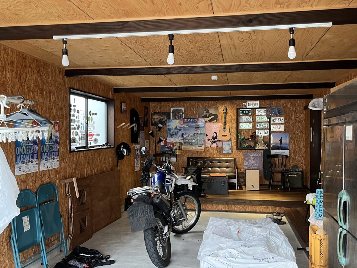 こちらの一番のおススメポイントは、バイク乗りにはウレシイ広いガレージがある、というトコロ! この日は宿泊がワタクシのみ、ということで奥の小上がりのソファでくつろぎつつ愛車を眺める最高の時間を満喫♪