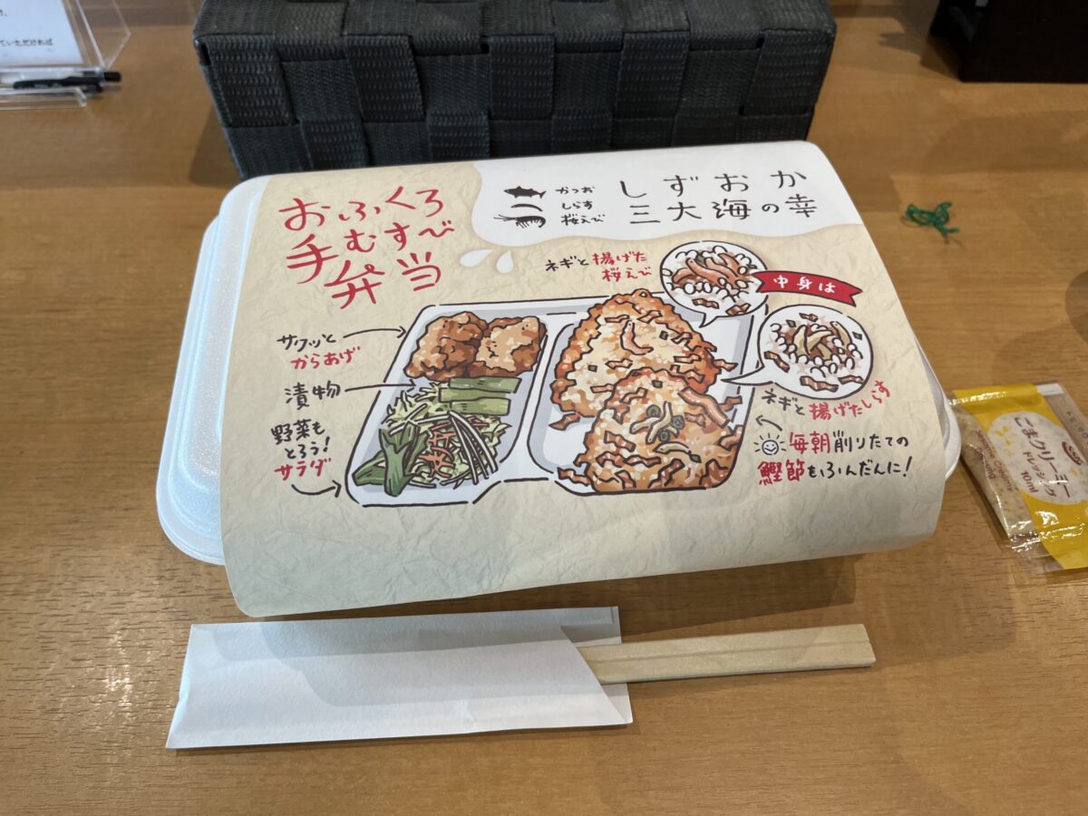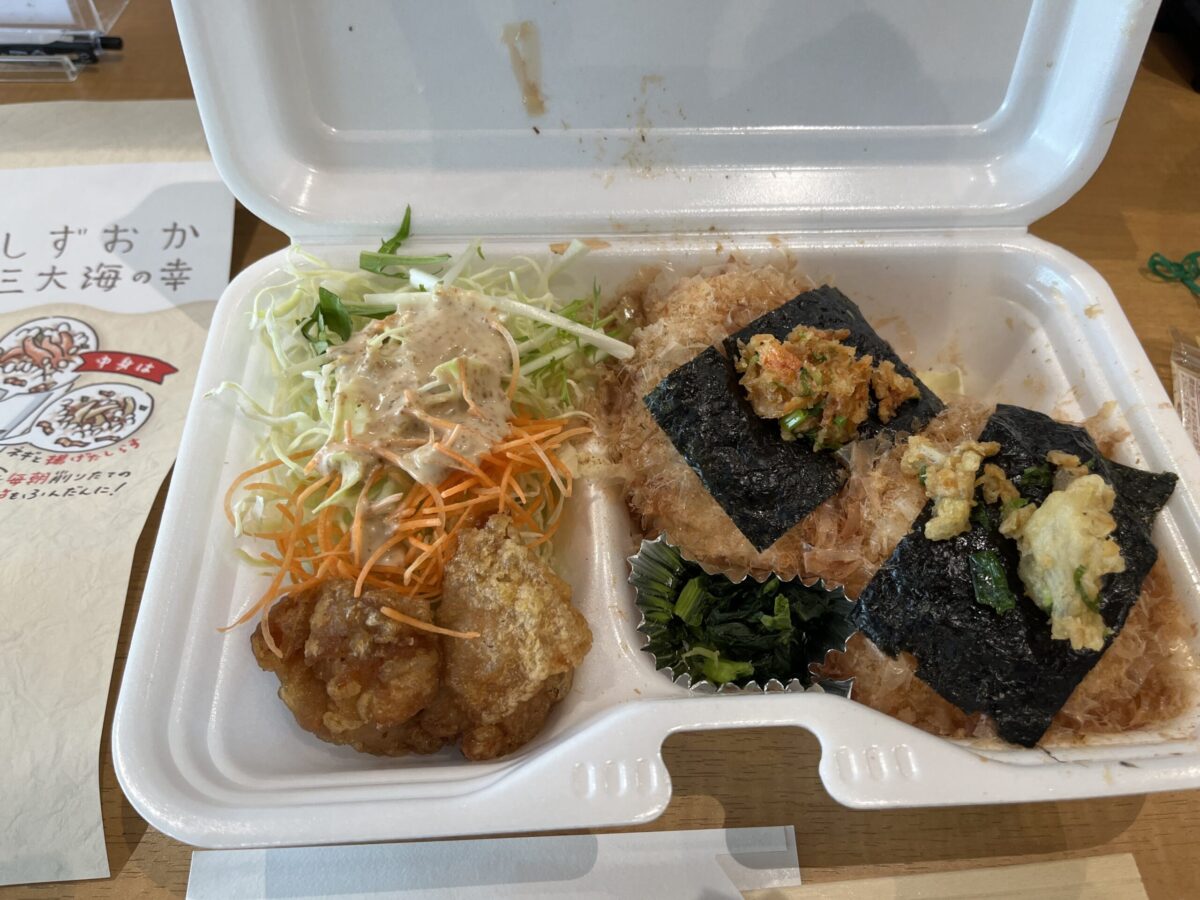 「もしよかったら静岡の名物が詰まったお弁当なんですが店内で食べてもいいのでいかがですか?」よく確認もせず、まあこれもご縁だからと受け取ったのがコチラ。
